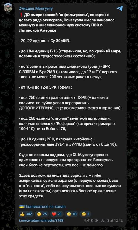 "Судя по первым кадрам, где США уже уверенно применяют в воздушном пространстве Венесуэлы свои боевые вертолеты, это все - не помогло. Здесь возможны лишь два варианта – либо американцы сумели заранее (в первую очередь), все это "вынести", либо венесуэльские военные не сумели (или не захотели) организовать боевое применение этих средств", - пишет Машовец.