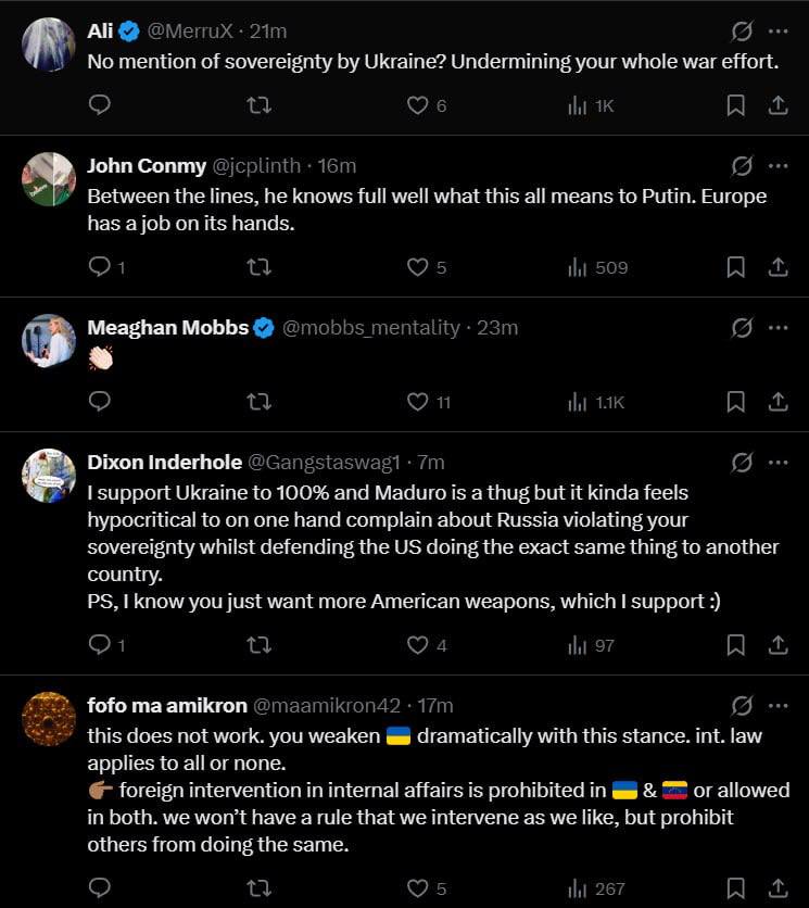 "Я на 100% поддерживаю Украину, и Мадуро — бандит, но мне кажется лицемерным с одной стороны жаловаться на то, что Россия нарушает мой суверенитет, а с другой — защищать США, которые делают то же самое с другой страной", - ответил Сибиге один из пользователей.