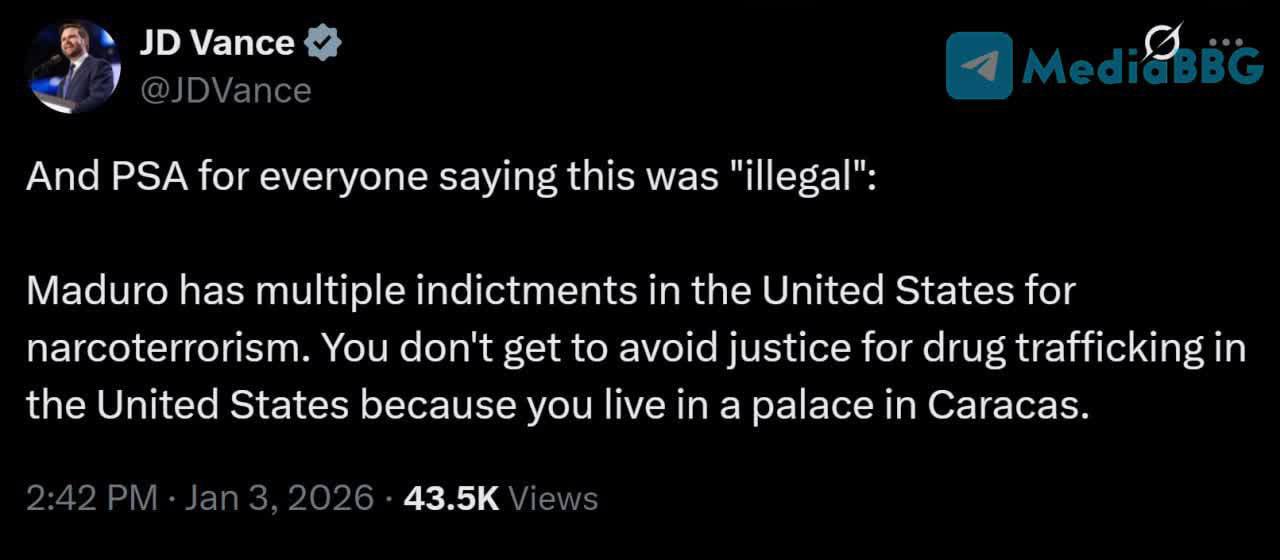 "И предупреждение для всех, кто говорит, что это было "нелегально": Мадуро имеет несколько обвинительных приговоров в Соединенных Штатах за наркотерроризм. Вы не можете избежать правосудия за торговлю наркотиками в Соединенных Штатах, просто потому что живете во дворце в Каракасе", - заявил Вэнс.