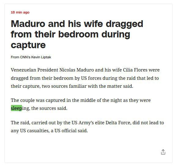 16:31 Американский спецназ из отряда "Дельта" захватили Мадуро с супругой, пока они спали в своей резиденции.
