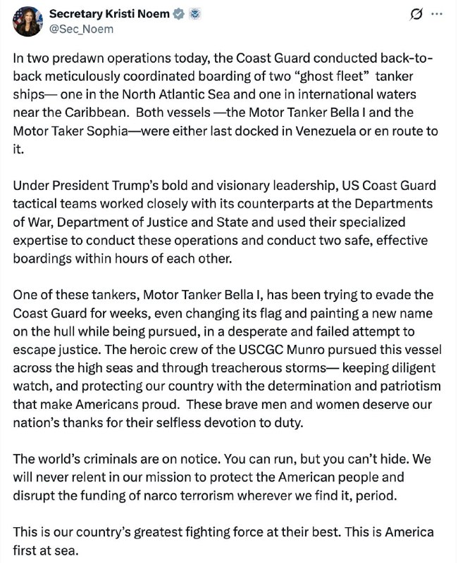 "В ходе операции, проведенной сегодня утром на рассвете, Министерство обороны в координации с Министерством внутренней безопасности без происшествий задержало танкер теневого флота, находившийся под санкциями и не имевший гражданства. Задержанное судно, танкер Sophia, действовало в международных водах и осуществляло незаконную деятельность в Карибском море. Береговая охрана США сопровождает танкер Sophia в США для окончательного решения вопроса. В рамках операции "Южное копье" Министерство обороны неуклонно следует своей миссии по пресечению незаконной деятельности в Западном полушарии. Мы будем защищать нашу родину и восстанавливать безопасность и силу на всей территории Америки", - сказано в публикации командования в Х.