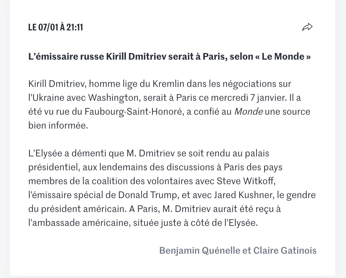 При этом в Елисейском дворце опровергли визит Дмитриева. Предполагается, что Дмитриева могли принять не во французском, а в американском посольстве по соседству.