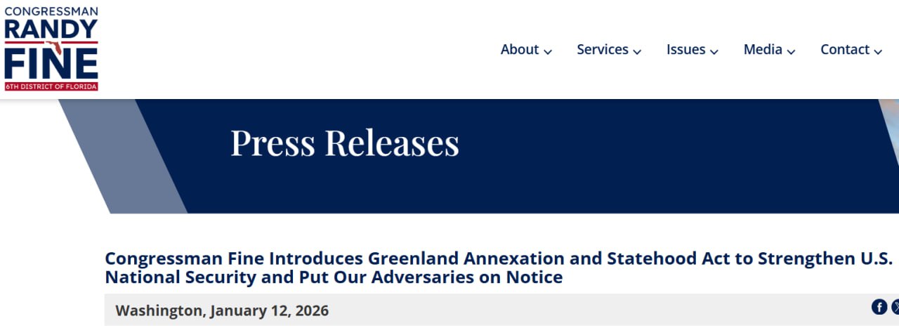 Конгрессмен-республиканец Рэнди Файн внёс законопроект об "аннексии и предоставлении статуса штата" Гренландии со стороны США.