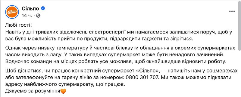 14.16 В Киеве продолжают закрываться супермаркеты из-за длительных отключений света, сообщают местные телеграм-каналы. Возле работающих супермаркетов выстраиваются очереди.