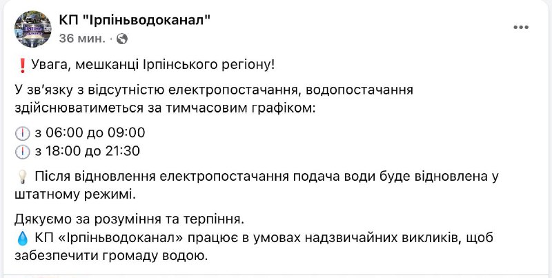 17.48 В Ирпене будут давать воду по графикам из-за отсутствия света: 3 часа утром и 3 часа вечером, сообщает водоканал.
