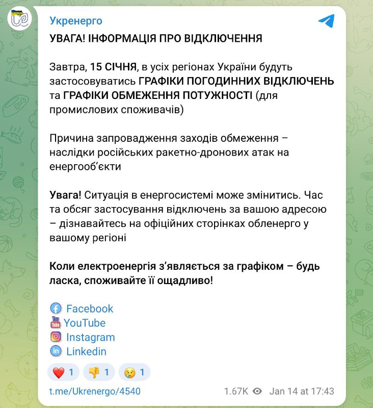 17.44 Завтра во всех областях будут действовать графики отключений света, заявляет "Укрэнерго".