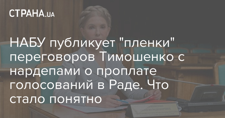 Национальное антикоррупционное бюро (НАБУ) публикует, как сообщается, переговоры лидера партии "Батькивщина" Юлии Тимошенко с народными депутатами об оплате за их голосования в Верховной Раде.