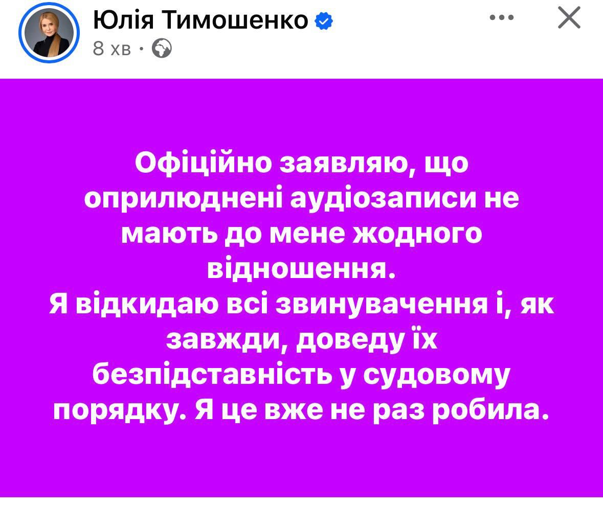 "Официально заявляю, что обнародованные аудиозаписи не имеют ко мне ни одного отношения. Я отвергаю все обвинения и, как всегда, докажу их безосновательность в судебном порядка. Я это уже не раз делала", - написала Тимошенко в Фейсбуке.