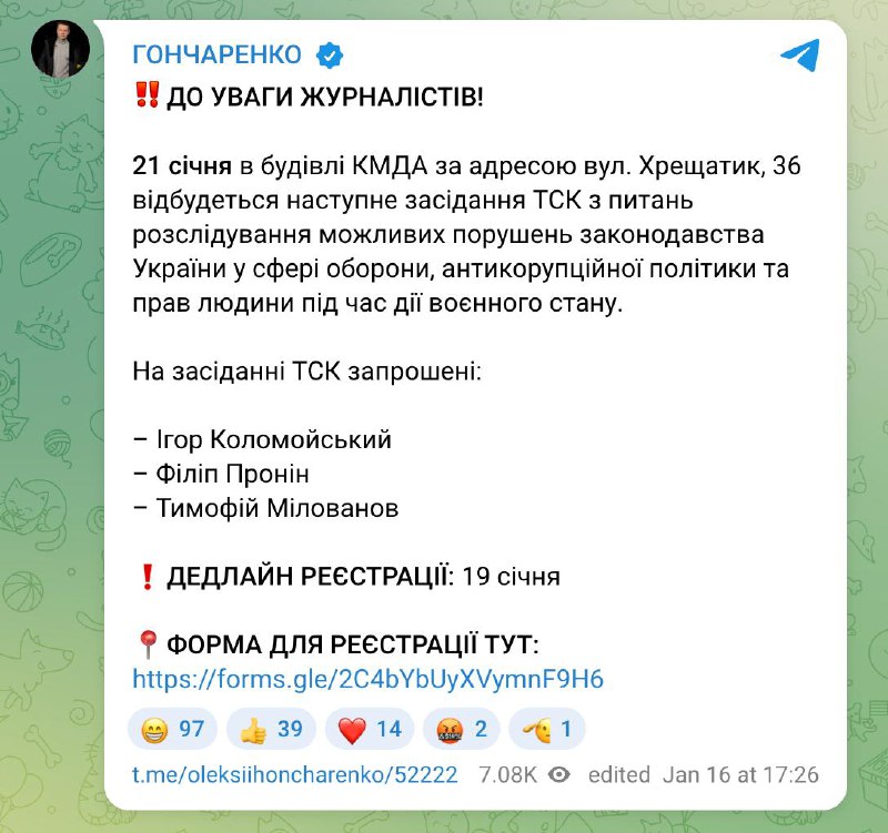 "21 января в здании КГГА по адресу ул. Крещатик, 36 состоится следующее заседание ВСК по расследованию возможных нарушений законодательства Украины в сфере обороны, антикоррупционной политики и прав человека во время действия военного положения", - говорится в сообщении.