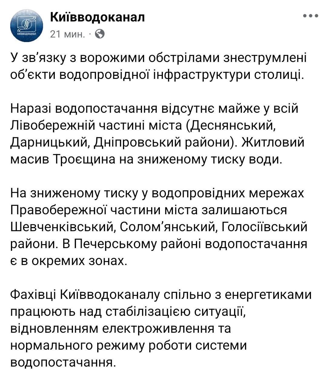 9.09 После обстрела в Киеве без водоснабжения остались Деснянский, Дарницкий и Днепровский районы, сообщили в горводоканале.