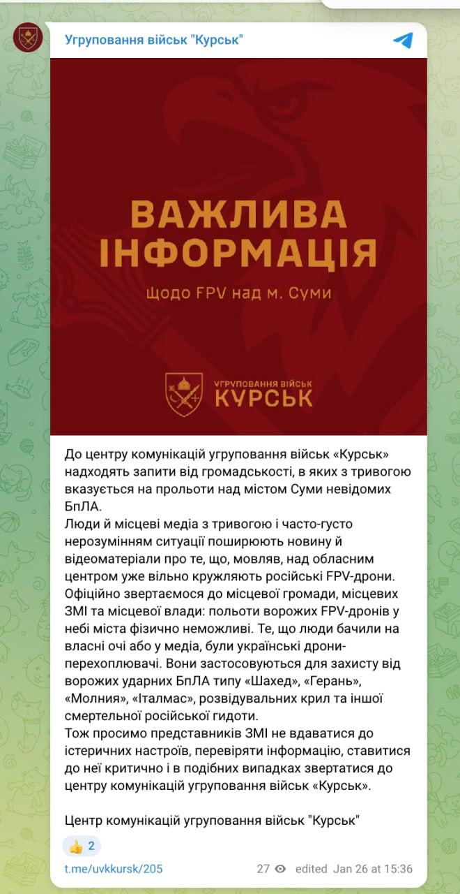 "В центр коммуникаций группировки войск "Курск" поступают запросы от общественности, в которых с тревогой указывается на пролёты над городом Сумы неизвестных БпЛА. Полёты вражеских FPV-дронов в небе города физически невозможны. То, что люди видели собственными глазами или в медиа, - это были украинские дроны-перехватчики. Поэтому просим представителей СМИ не поддаваться истерическим настроениям", - заявили военные.