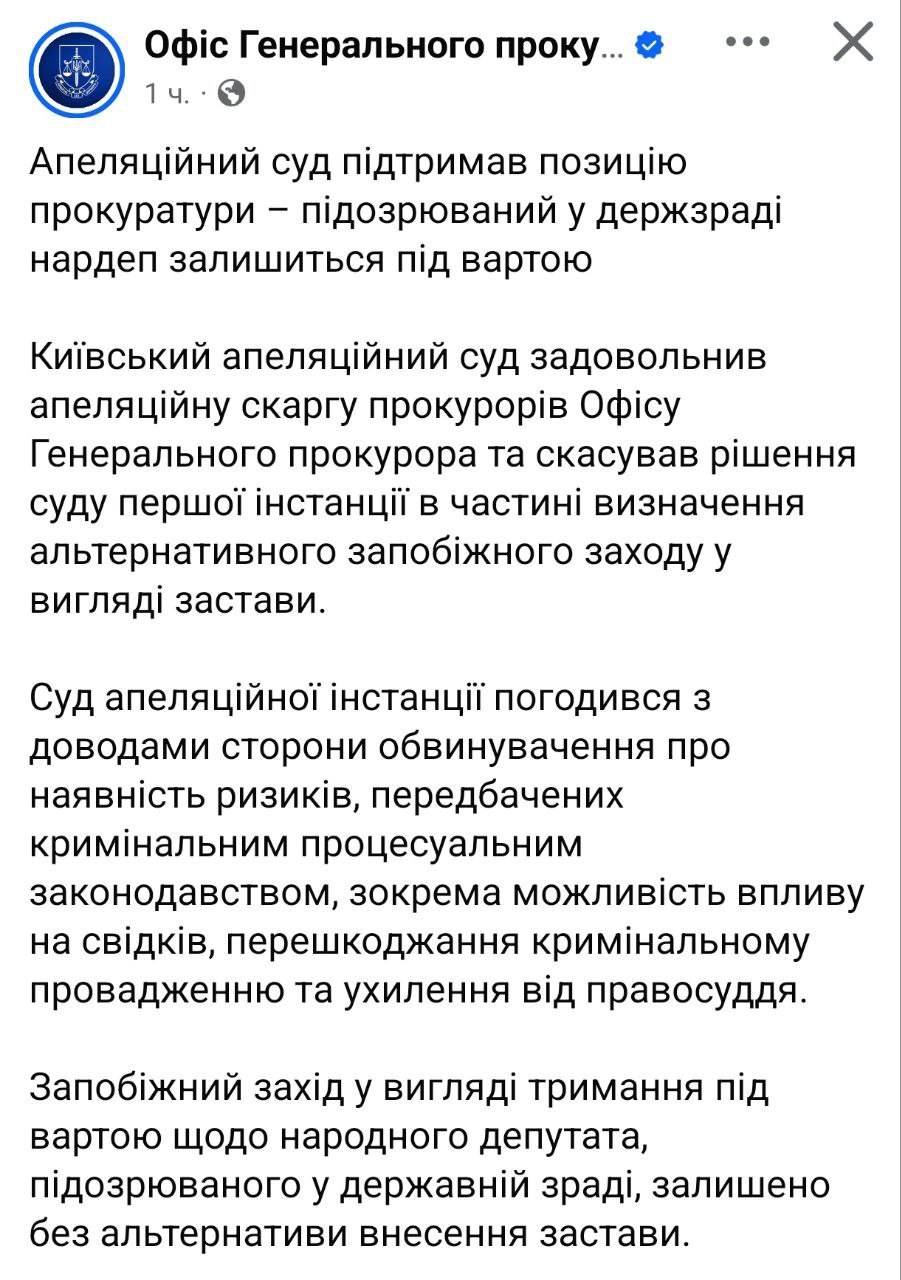 Решение суда первой инстанции о возможности внесения залога для подозреваемого в государственной измене народного депутата было отменено.