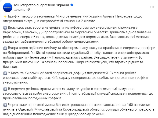 Также чиновник привел подробности вчерашнего удара по служебному автобусу с шахтёрами. По его словам, дроны атаковали транспорт одного из энергопредприятий вблизи шахты "Терновская" в Павлоградском районе Днепропетровской области. В результате погибли 16 работников шахты, еще 14 получили ранения.