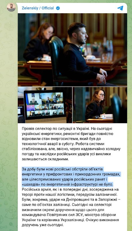 А вот Владимир Зеленский на селекторном совещании, посвященном ситуации в энергетике, заявил, что Россия не специально била по упомянутым объектам после завершения энергетического перемирия.