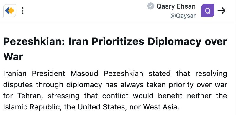 Накануне Пезешкиан заявлял, что Тегеран предпочитает дипломатию войне, но "не может быть принужден к переговорам с помощью угроз или насилия".
