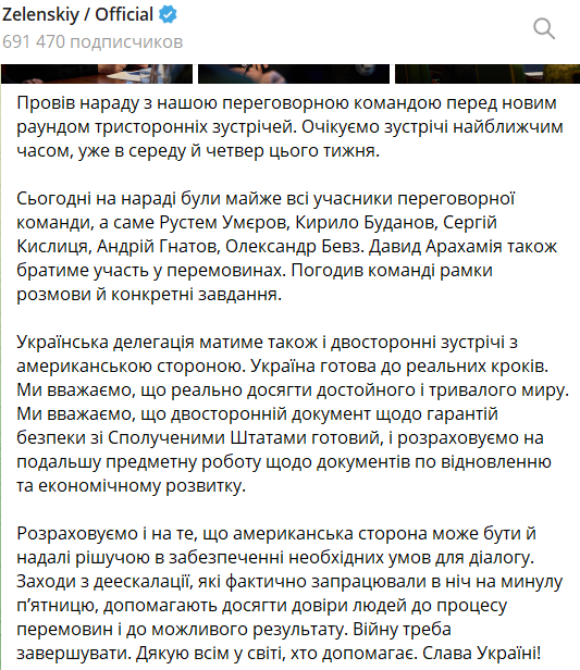Об этом Зеленский написал в своем телеграм-канале по итогам встречи с украинской делегацией.