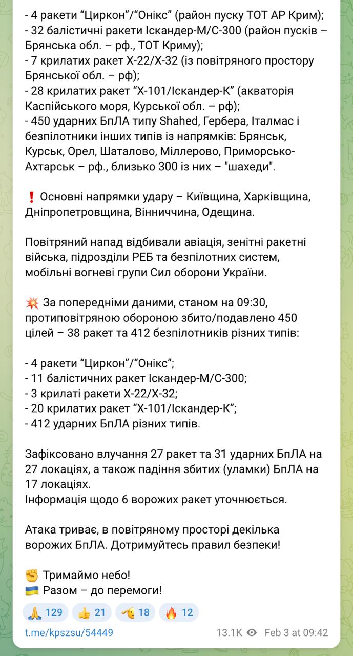 9.30 РФ этой ночью выпустила по энергетике Украины более 70 ракет, в том числе большое количество баллистических, и 450 БпЛА, сообщает Зеленский.