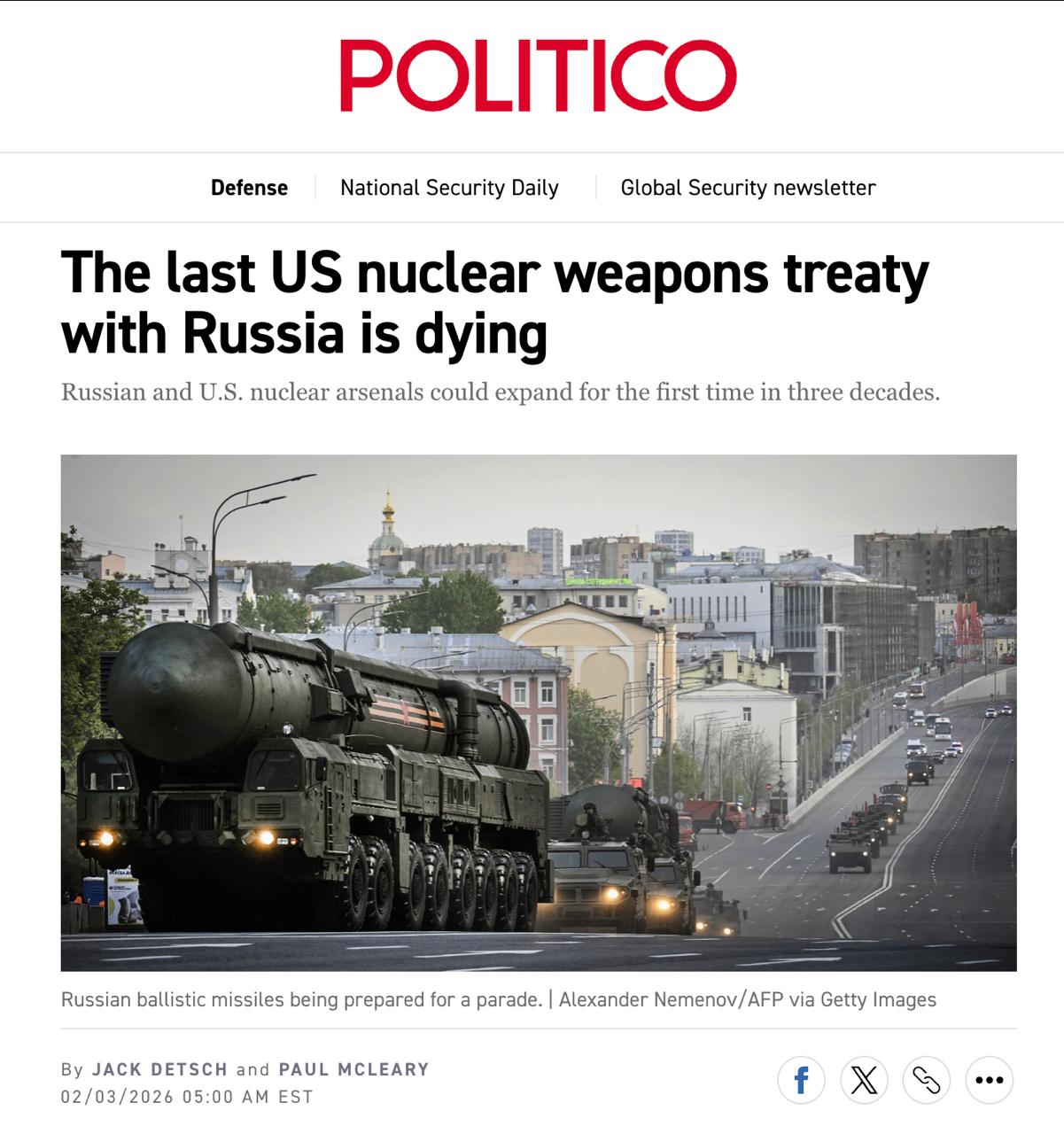 "Вероятный разрыв соглашения происходит в особенно напряженный момент. Россия и Китай расширяют свои стратегические арсеналы, а Кремль угрожает применить ядерное оружие против Украины. Россия за последнее десятилетие значительно расширила свои ядерные вооружения средней дальности, способные нести ядерный потенциал, например, баллистическую ракету "Орешник", которую она использовала в боевых действиях против Украины. Китай более чем вдвое увеличил размер своего ядерного арсенала, в то время как США сократили количество некоторых платформ, способных нести ядерное оружие", - пишет издание.