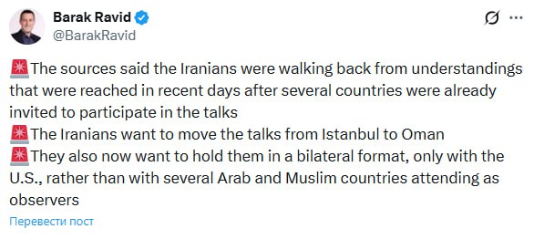 "Источники сообщили, что иранцы отказываются от достигнутых в последние дни договоренностей, после того как ряд стран уже были приглашены к участию в переговорах. Иранцы хотят перенести переговоры из Стамбула в Оман. Теперь они также хотят проводить их в двустороннем формате, только с участием США, а не с участием нескольких арабских и мусульманских стран в качестве наблюдателей", – сообщил Равид.