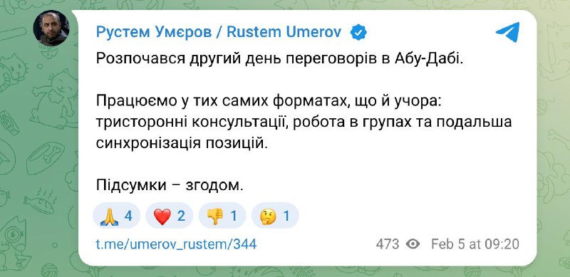 09:24 В Абу-Даби начался второй день переговоров Украины, США и РФ, сообщает глава украинской делегации Умеров.