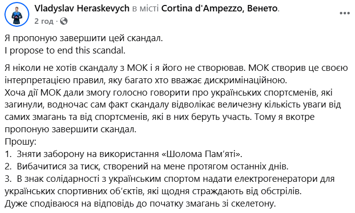 "Прошу: снять запрет на использование шлема памяти. Извиниться за давление, оказанное на меня в последние дни. В знак солидарности с украинским спортом предоставить электогенераторы для украинских спортивных объектов, которые ежедневно страдают от обстрелов. Очень надеюсь на ответ до начала соревнований по скелетону", - написал спортсмен.