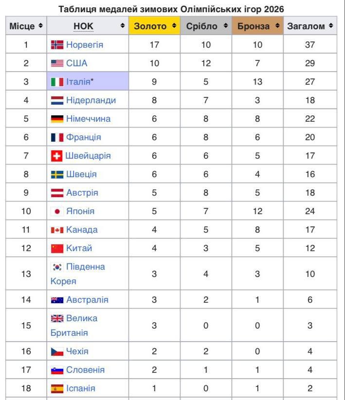 Об этом свидетельствует таблица медалей зимних Олимпийских игр 2026 года.