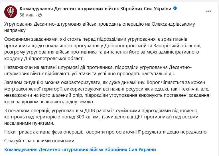 Командование десантно-штурмовых войск заявило о контратаках Вооруженных сил Украины на Александровском направлении (стык Запорожской и Днепропетровской области).