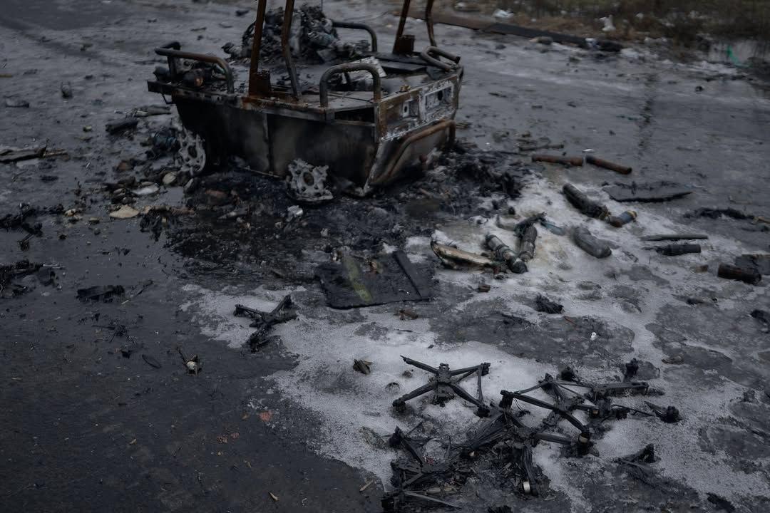 13:19 Так сейчас выглядит дорога с Константиновки на Дружковку. Видны разбитые автомобили, наземные дроны и военная техника.
