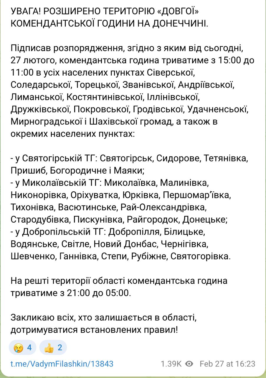 Он введен уже с сегодняшнего дня в Северской, Соледарской, Торецкой, Звановской, Андреевской, Лиманской, Константиновской, Ильиновской, Дружковской, Покровской, Гродовской, Гродовской общинах, а также в отдельных населенных пунктов Святогорской, Николаевской и Добропольской общин.