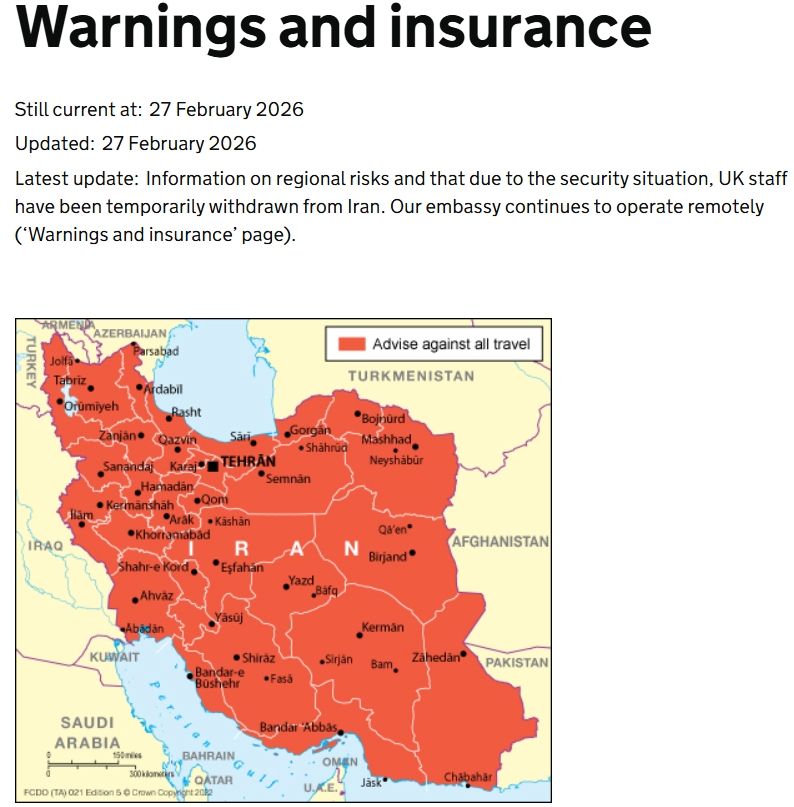 "Поддержка со стороны правительства Великобритании в Иране крайне ограничена. В чрезвычайных ситуациях личная консульская помощь будет невозможна", - говорится в пресс-релизе.