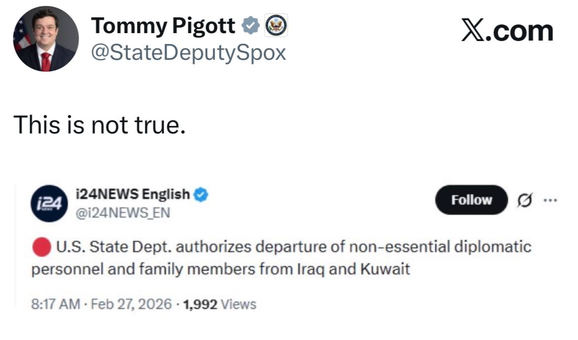 В Государственном департаменте США опровергли информацию о том, что Штаты санкционировали выезд части дипломатов и их семей из Ирака и Кувейта.
