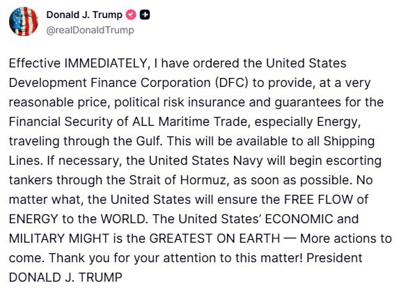 "С настоящего момента я приказал Корпорации развития финансов США (DFC) предоставлять по очень разумной цене страхование политических рисков и гарантии финансовой безопасности всей морской торговли, особенно энергоресурсами, проходящей через Персидский залив. Эта поддержка будет доступна всем судоходным линиям. При необходимости Военно-морские силы США начнут сопровождать танкеры через Ормузский пролив как можно скорее. Вне зависимости ни от чего, США обеспечат свободный проток энергии в мир. Экономическая и военная мощь США – величайшая на земле. Будут предприняты дополнительные меры", – сообщил Трамп.