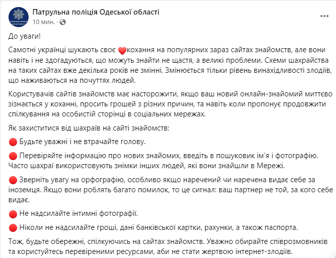 Патрульна поліція на Одещині публікує методичку, як розпізнати шахрая на сайті знайомств.