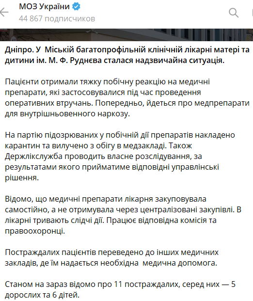 Зазначається, що у постраждалих тяжка побічна реакція на медпрепарати, які застосовувалися під час проведення оперативних втручань. За попередньою інформацією, йдеться про препарати для внутрішньовенного наркозу.