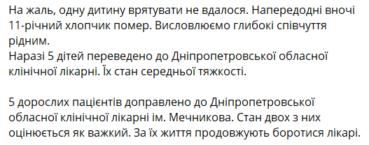 "Наразі п'ятеро дітей переведено до Дніпропетровської обласної клінічної лікарні. Їхній стан - середньої тяжкості", - наголошується в повідомленні міністерства.