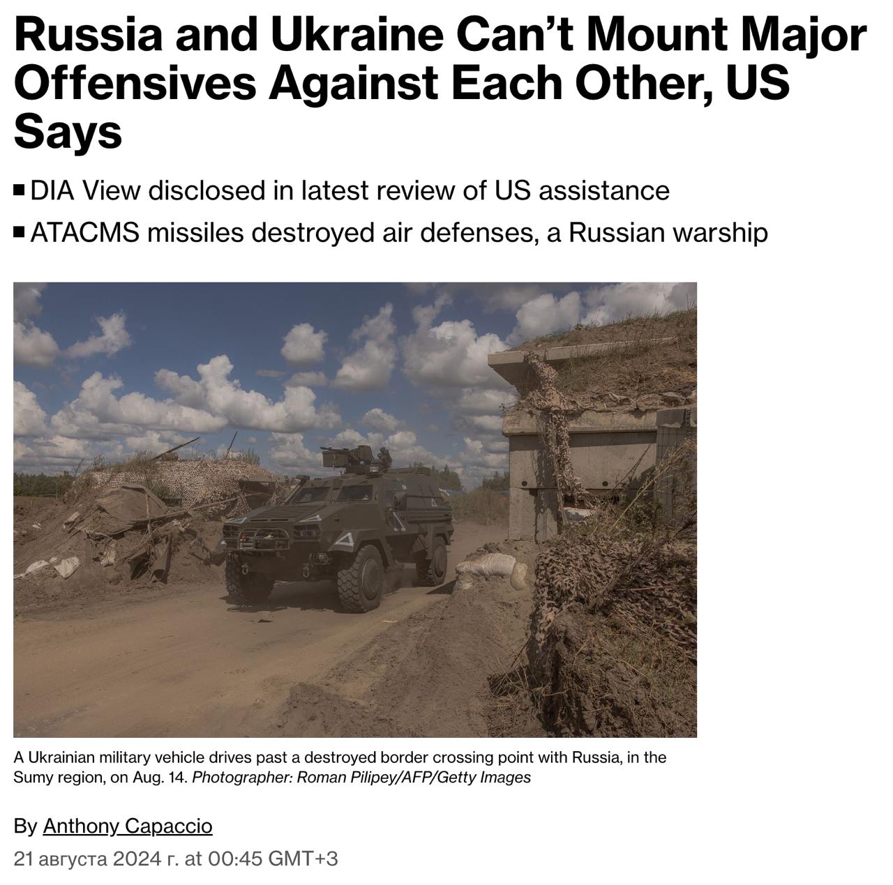 Розвідувальне управління міністерства оборони США вважає, що війна в Україні рухається до безвиході, оскільки ні Київ, ні Москва не мають достатніх військових ресурсів для проведення масштабних наступальних операцій.