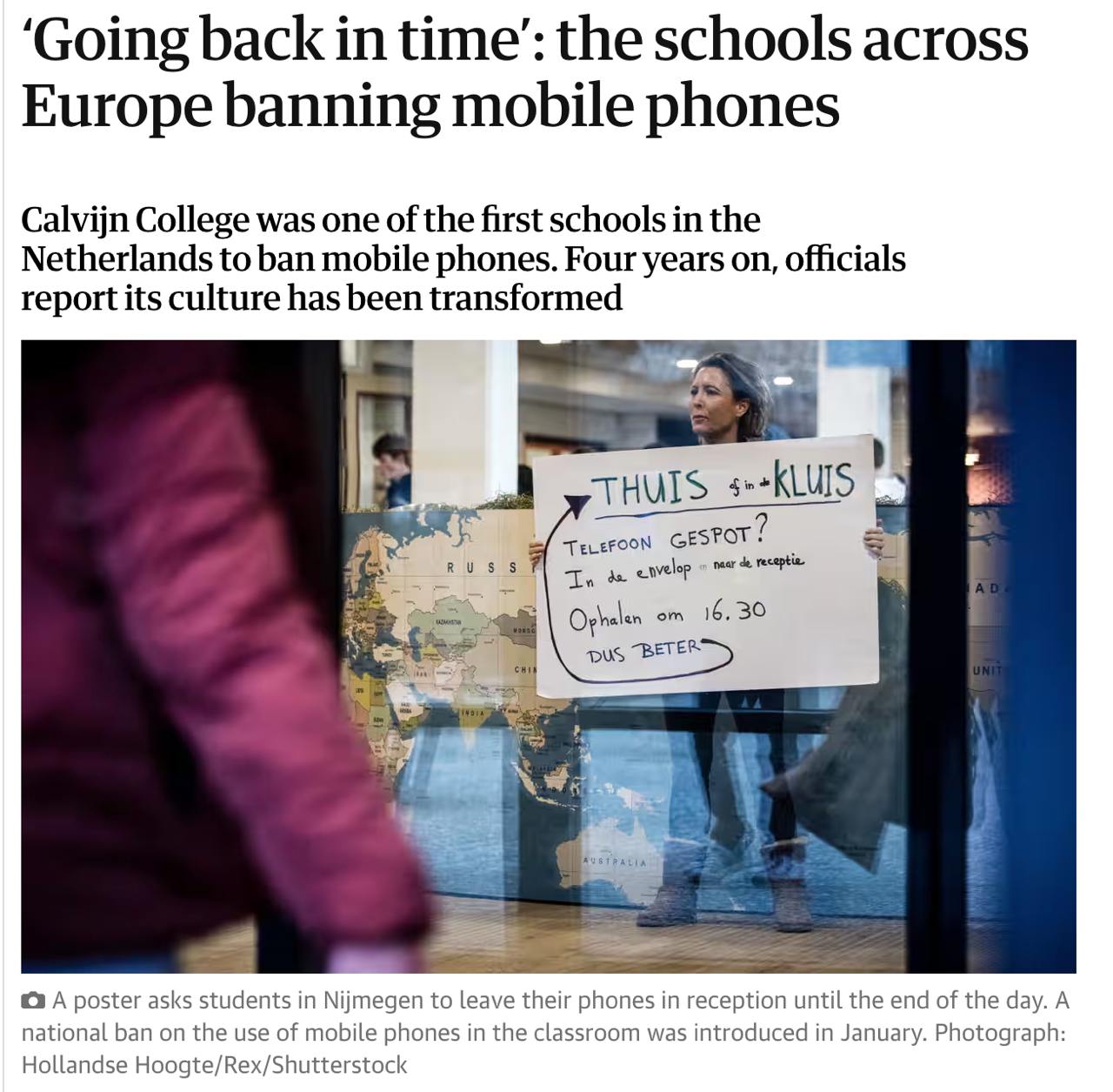 Першим був Calvijn College у Нідерландах майже чотири роки тому, а тепер приклад наслідують багато інших шкіл країни, а також Франції та Бельгії. В Угорщині навіть ухвалили окремий закон, який вимагає здавати телефони та смарт-пристрої на початку навчального дня. Італія та Греція дозволили носити із собою телефони, але заборонили їх використання у класах. У Росії з 1 вересня цього року також запроваджено заборону.