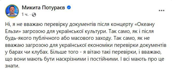 "Я не вважаю перевірку документів після концерту "Океану Ельзи" загрозою українській культурі. Так само, як і після будь-якого публічного або масового заходу. Так само, як не вважаю загрозою для української економіки перевірки документів у барах чи клубах. Більше того – я вітаю такі перевірки, і вважаю, що вони мають бути наскрізними та постійними. І всі мають про це знати", - заявив Потураєв.