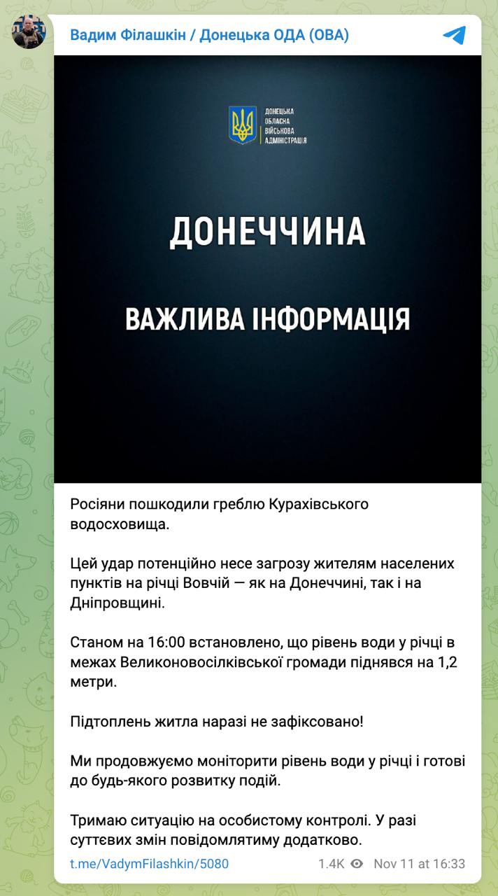 Раніше українські та російські телеграм-канали першими написали про підрив споруди. За їхніми даними, таким чином росіяни розраховують затопити дороги, якими забезпечуються гарнізон у Кураховому, а також українські сили на північ від річки Вовчої та Курахівського водосховища.