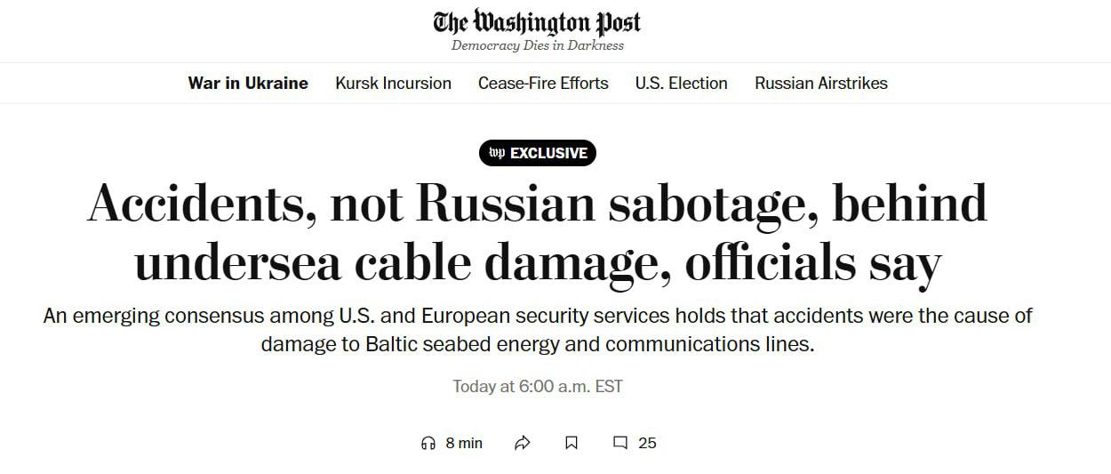 За словами кількох представників американських та європейських розвідок, розриви підводних кабелів, найімовірніше, були результатом морських аварій, а не російського саботажу.