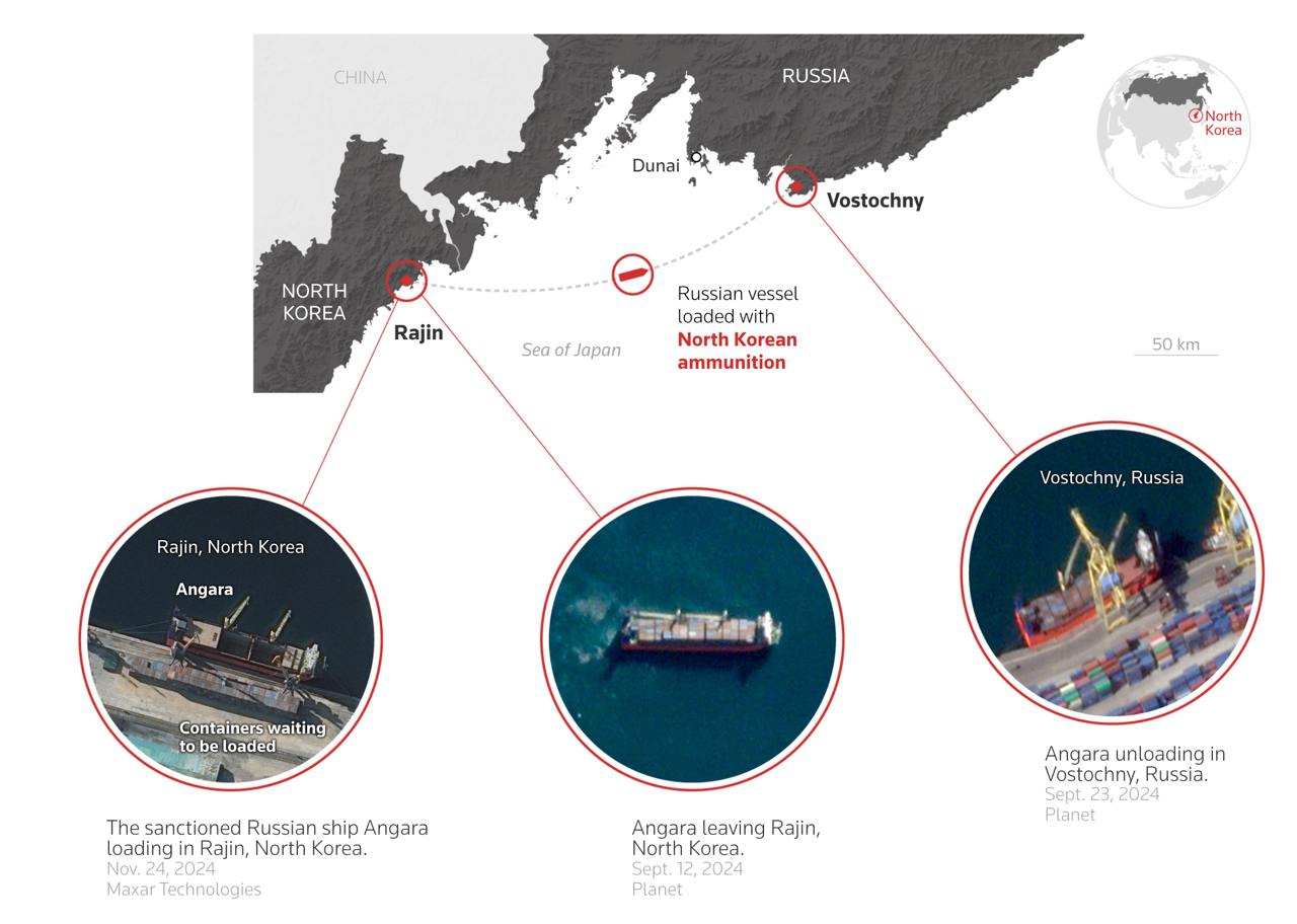Снаряди переправляються залізницею на склади біля кордону РФ та України, головним чином Тихорецька. До перевезень північнокорейських боєприпасів було залучено чотири вантажні судна під російським прапором: "Ангара", "Леді Р", "Марія" та "Майя-1".