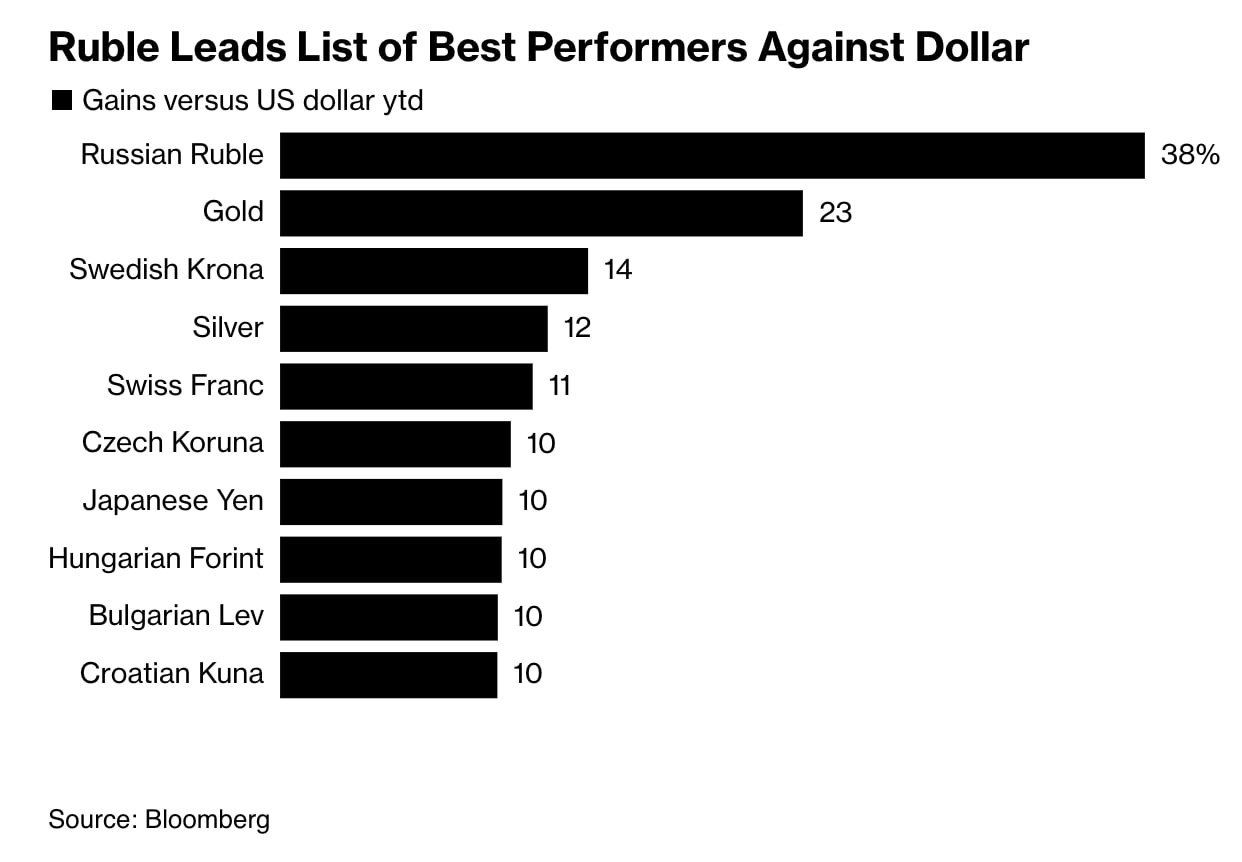 З початку року російський рубль продемонстрував найсильніше зростання до долара серед світових валют. Рубль випередив навіть номіноване в доларах золото.
