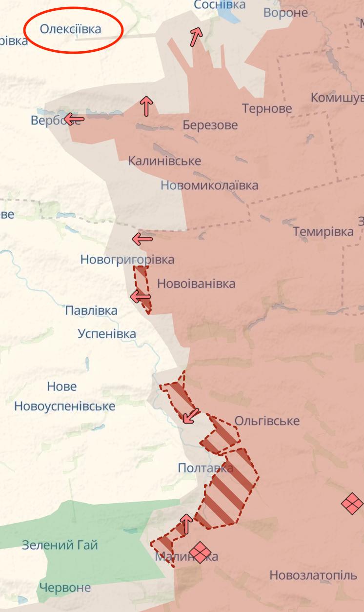 Крім того, на карті з 6 жовтня з'явився довгий виступ сірої зони у бік Олексіївки Дніпропетровської області (обведено). Армія РФ прорвалася туди, скориставшись туманом, повідомляє Deep State.