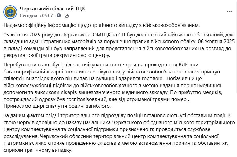 "Перебуваючи в автобусі, під час очікування своєї черги на проходження ВВК при багатопрофільній лікарні інтенсивного лікування, у військовозобов'язаного стався напад епілепсії, внаслідок якого він випав на вулицю і вдарився головою", - йдеться у повідомленні.