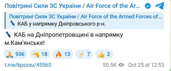 "КАБ на Дніпропетровщині у напрямку м.Кам'янське", - повідомили у Повітряних силах.