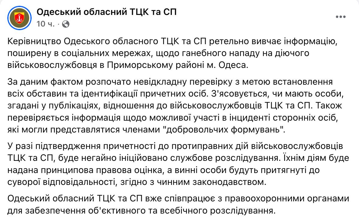 Після публікації Одеський обласний ТЦК та СП у тій же соцмережі заявив, що "ретельно вивчає інформацію" та проводить перевірку, хоча Грамарчук вимагає відкрити кримінальну справу. У ТЦК заявили, що "перевіряється інформація про можливу участь в інциденті сторонніх осіб, які могли надаватися членами добровольчих формувань".