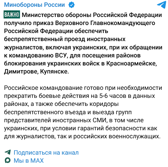 Як зазначили у відомстві, Москва готова тимчасово призупинити бойові дії для безпечного доступу та подальшого виїзду журналістів.