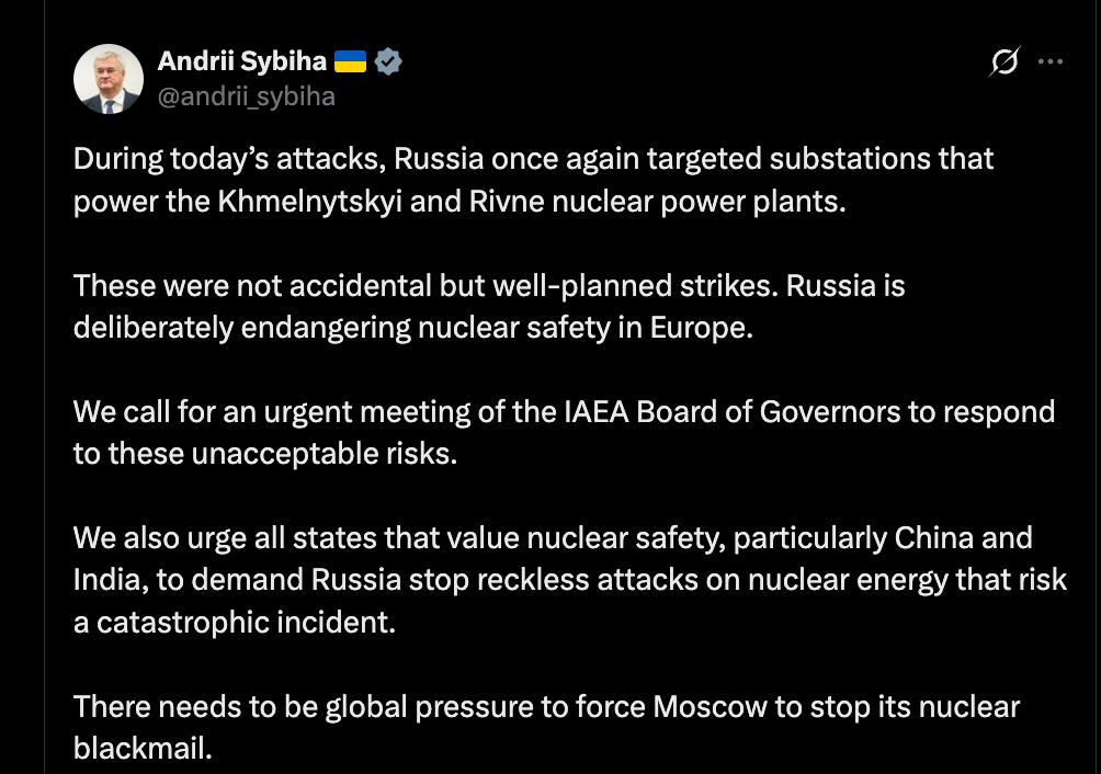 "Росія навмисно ставить під загрозу ядерну безпеку в Європі. Ми закликаємо до термінового скликання засідання Ради керуючих МАГАТЕ для реагування на ці неприйнятні ризики. Ми також настійно закликаємо всі держави, які цінують ядерну безпеку, особливо Китай і Індію, вимагати від Росії припинити безрозсудні атаки на ядерну енергію. тиск, щоб змусити Москву припинити ядерний шантаж", - написав глава МЗС.