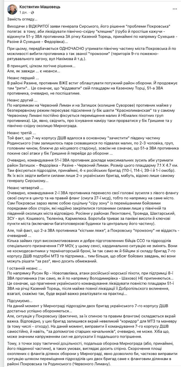 "Виходячи з відкритої заяви генерала Сирського, його вирішення "проблеми Покровська" полягає в тому, щоб ліквідувати північно-східні "кліщі" - простіше кажучи, відкинути 51-у загальновійськову армію противника за річку Казенный Торець, принаймні в напрямах Сухецьке - Північно-Піноцька у Разино і Сухецько. Покровська і, по можливості, вибити супротивника з так званої "промзони" (район 9-го пожежно-рятувального загону, вулиця Нахімова тощо), пише Машовець.