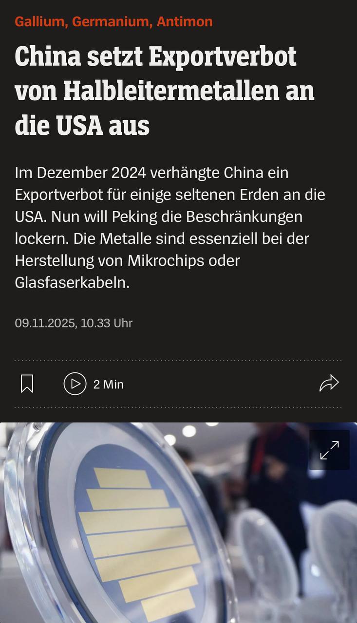 "Пекін призупинив дію заборони на експорт у США галію, сурми та германію — металів, необхідних для виробництва напівпровідників. США, як і інші країни, закуповують цю сировину практично повністю в Китаї. Наприклад, галій та германій використовуються в мікрочіпах, оптоволоконних кабелях та сонячних батареях", - йдеться у статті.